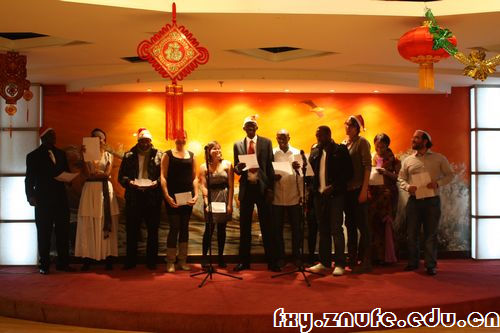 为了加强法学院留学生与导师之间的联系,增进师生感情,同时促进法学院中外学生之间的交流、友谊和合作,使法学院留学生在远离家乡的中国度过一个愉快的新年,2011年法学院中外学生新年联欢会于2011年12月26日晚在诺威香卡国际大酒店成功举行。 莅临本场晚宴的领导和老师有,法学院院长刘仁山教授、法学院副院长简基松教授,以及来自法学院各专业、团委、研究生工作部的领导和老师。来自欧、亚、非、澳各大洲二十余国家的48名法学院留学生和来自法学院的10名中国学生共同参加了新年联欢。 晚上六点,法学院副院长简基松教授宣布联欢会正式开始。法学院院长刘仁山教授致辞,首先向留学生及在场所有来宾致以节日的问候,随后向留学生简要介绍了学校以及法学院的基本情况,阐发了学校、学院与中外学生一道开拓创新的共同愿景。刘老师希望法学院来自不同国家、有着不同信仰、不同肤色的同学们共同进步、增进友谊,为法学院这个大家庭共同奋斗,创造新的辉煌。 在联欢会中,留学生同法学院的老师,就学习、生活、个人发展等问题,进行了轻松、愉快的交流。法学院学生代表金星梦、李源代表法学院同学发言,热烈欢迎各位领导和老师、留学生参与此次联欢会,希望中外同学友谊地久天长,祝愿老师和同学们新年快乐。 法学院的中外同学们表演了精心准备的精彩节目。蒋鹿夏等同学的伴奏演唱《Knocking on Heaven’s Door》,开启了本场联欢会的精彩演出,琴瑟和谐,优美动听。接下来娜佳等13名留学生一起,为大家演唱了经典英文歌曲《Jingle Bell》。中外学生还饶有兴致地即兴进行了多项趣味游戏。法学院副院长简基松教授带来的一曲《妈妈的羊皮袄》, 将联欢会推向了高潮。法学院老师与中外学生载歌载舞,弦歌一堂,欢聚新年。 本次联欢会在中外师生、学生之间搭起了一座友谊的桥梁。据悉,法学院将以此为基础,在今后将组织更多的特色中外交流活动,促进交流、加强联系、深化友谊。 (图 文:李源 金星梦)
