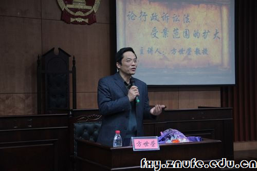 315日晚,以“论行政诉讼法受案范围的扩大”为主题的第二十七期中南说法在文泰楼模拟法庭(二)如期举行。本次讲座由中国法学会行政法学研究会副会长、我校学术委员会副主任、博士生导师方世荣教授担任主讲人,我校行政法与行政诉讼法教授、博士生导师戚建刚和宪法与行政法系曾祥明博士担任嘉宾。