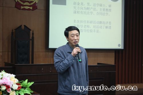 赵金龙老师首先强调了社会实践的重要性,指出书本中所学的法律都是理想中的法律,作为法科学子必须要经过社会实践这一关。赵金龙老师说,科研创新活动的关键是选题,随后强调了选题过程中应注意的几点问题:首先,针对性要强,在选题时应针对社会热点问题进行分析,在法学领域,落脚点应该多放在现有法律的构架上;其次应考虑综合性,他指出,思路不能仅局限于法学方面,应多学科、多层次地分析问题,并鼓励同学们跨学院组队;最后,赵老师提到选题必须具有可操作性,并从调查方式、内容、对象等方面具体分析。在调查实践方面,赵金龙老师对问卷调查的设计提出了几点建议。
