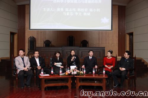 李文律师讲述了自己从事律师工作所经历的各种坎坷,并认为那段经历提高了自己的业务能力,“虽然过程很艰辛,但一定要相信,坚持就一定会成功!”陈小利律师则总结出一名优秀律师所应具备的五个条件:要有自己的主见思想,抗压能力,责任心,忠诚,保密。她强调律师应提高对自身的要求,不允许出现小的纰漏。而杨斌律师则重点指出,如今法科学子实务能力和逻辑思维能力较差,一个好的律师应当对案件的走向有非常强的控制能力,而这一点也是很多在校毕业生所欠缺的。马素芬律师的讲解侧重于律师行业的艰辛,要大家做好吃苦的心理准备,并告诫大家要有雄心及足够的耐心,希望大家少走弯路。随后,陈志伟主任从法官的角度指出了现今法科学子的三点不足:一是专业知识不足、二是法律理论和法律思维不足、三是生活经验不足,并用风趣幽默的语言举出许多法庭内外的例子,引得全场笑声不断。黄勇副教授则从法科学子法律事务能力不足的原因方面展开分析,认为这与教育体制有一定的关系。他指出,法律事务能力在校期间就应该注重培养,法学教育应重点放在提高法律实务能力的方面上来。