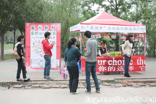 本次复赛满分为100分,户外营销和成果展示两部分各占40分,销售业绩占20分。户外营销环节于15日进行。20名复赛选手抽签分成四组,分别在环湖、五羊广场、滨湖进行营销活动。每组均有一名评委全程跟踪,从市场分析、营销策略、销售表现、团队配合四个方面考察选手们表现。付开燕和吴楠同学在各自团队中积极参与,热情洋溢,分别获得37分和36.5分的高分。