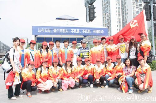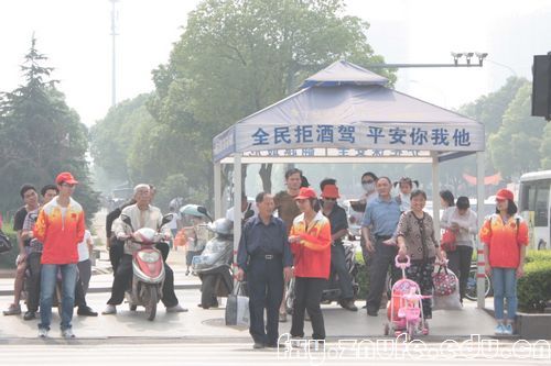志愿者们分守在十字路口的人行道旁,当行人焦急,想要闯红灯时,志愿者就及时提醒行人注意交通规则。当信号灯转为绿灯时,志愿者们退到两侧,引导行人安全迅速过马路。