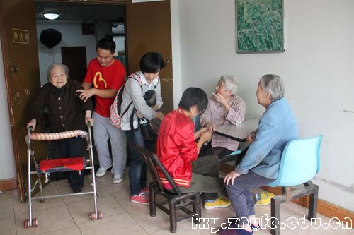 刚进门,志愿者纷纷亲切地与老人们打招呼,老人们也拉着志愿者们的手聊着家长里短。房间里一片欢声笑语,有的志愿者小心地为老人剪指甲;一些志愿者搀扶老人到处走走;还有志愿者则与老人围坐一团,听老人们分享他们以前的故事和见闻。有些老人们腿脚不太灵活,志愿者们就坐在床边为他们唱起了《军中绿花》。