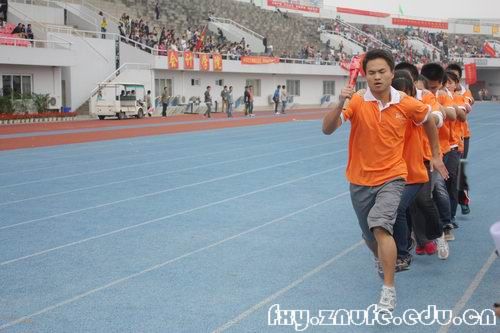 作为团体项目的时代列车的比赛,法学院以第一名的成绩打破校运会记录,展现了我院团结协作、齐心合力的良好的精神面貌。时代列车作为一个团体项目,最重要的就是大家要步伐一致。今天法学院这列由10名11级学生组成的橘红色列车一开动便展现出了良好的协调性,在通过第一个转弯处时便已超过了所有的对手。随着进入直道,法学院的优势更加明显,场上的啦啦队更是全体起立为他们呐喊加油,最后这队王者之师以谁与争锋的气势首先越过终点,并以43秒68的成绩打破校运会的记录。