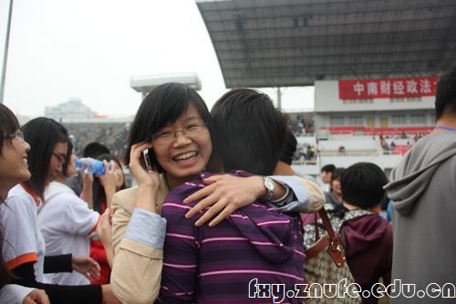 齐心协力跑完美折桂后,法学院学办张今柯老师激动地与王欢同学拥抱,传递着夺冠的喜悦心情。王欢同学作为齐心协力队员,由于训练期间脚扭伤无法参赛,仍然到场为自己的队员加油助威。