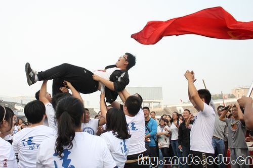校运会最后一战拔河比赛法学院霸气斩获三连冠,拔河队队员抑制不住兴奋,高举队长黄千峰以示庆祝。
