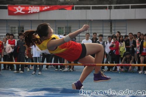 在10月25日女子跳高比赛中我院1106班李乐同学虽然没有获得很好的名次,但其跳高标准而优美的姿势定格在观众眼球,构成运动会一道靓丽的风景。
