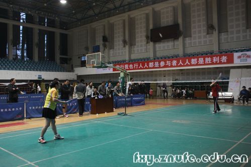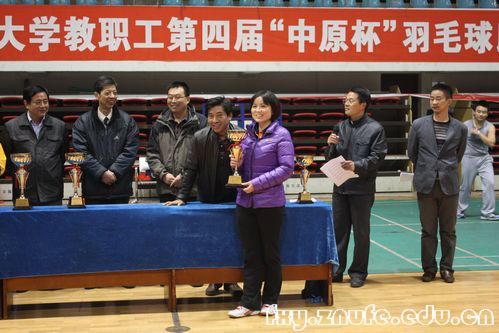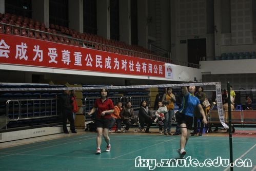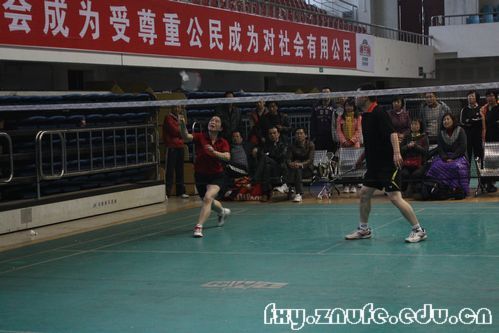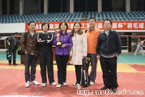 11月8日下午,中南财经政法大学教职工第四届“中原杯”羽毛球团体赛在南湖体育馆结束。法学院代表队逆转战胜后勤集团代表队获得团体比赛第三名,校机关代表队和体育部代表队并列获团体比赛第一名。袁桂君老师与巢容华老师的双打组合,获得女子双打单项第三名的佳绩。团委副书记张今柯老师、2011级辅导员郝新春老师到场为法学院代表队加油助威。