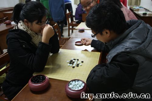 此次比赛采用淘汰赛制的初赛和复赛,在决赛则采用积分制。在五子棋比赛现场,秩序井然,气氛严肃,处处透露着“你争我夺”互相厮杀的激烈场景,选手在棋盘上你来我往,招招逼人,各有千秋,黑白子之间不断变换,稍有不慎,满盘皆输。平日里温柔娇小的女生在棋盘上也露出咄咄逼人的杀气,真有点巾帼不让须眉的豪爽和霸气。