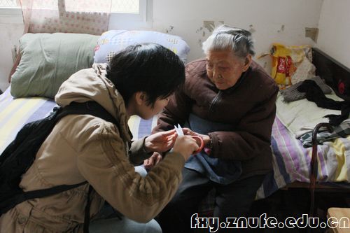 “奶奶,您的指甲需要剪剪了吧,我来帮您!”法1103班吕一竹同学跟随法志协爱心事业部前往江夏区中心福利院,发现老奶奶眼神不好,主动为老奶奶剪指甲。祖孙俩亲密的举动被随行记者抓拍了下来。