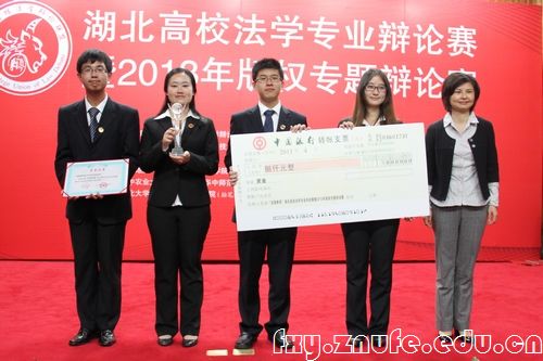 最终,法学院辩论队以5:2的比分,蝉联比赛冠军。评委们肯定了我方辩论的实力,认为我方引用的例子十分贴切,能够有力地佐证辩题,并赞扬了我方一直紧紧围绕主题展开辩论这一优点。随后的颁奖仪式中,武汉市副市长刘英姿为我方选手颁奖,并发表讲话。