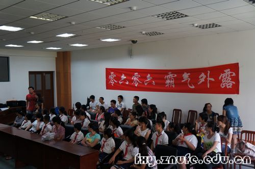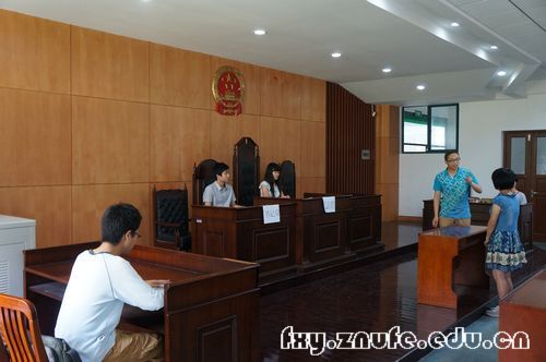 16名志愿者每人带领一名小学生来到模拟法庭(二),观看法1206班精心准备的模拟法庭。法1206班的同学别出心裁,采用情景表演的方式展现案发经过,引起小学生们极大的兴趣。法庭现场模拟英美法庭审理过程,台上,证人轮番上场,各方律师严密周详地盘问对方证人,逻辑清晰,处处设置陷阱,并展开激烈辩论。台下,小学生们一边观看表演,一边听志愿者讲解法庭的人员设置、审理流程、案件涉及的相关法律条文以及英美法系的审判制度和大陆法系的区别。