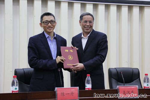 吴汉东教授代表学校正式聘请陈一丹先生为中南财经政法大学名誉教授并颁发聘书。陈一丹对吴汉东教授表示感谢,并表示十分高兴能就腾讯法务的历程与公司法务的培养与同学们交流。