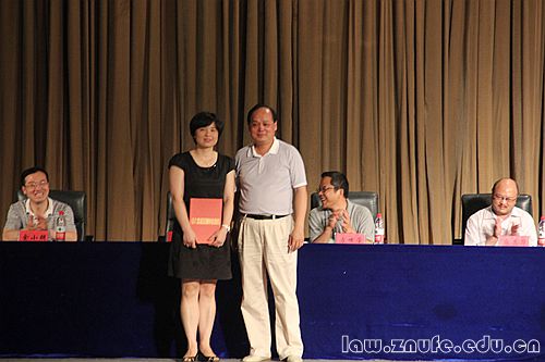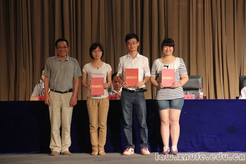 蔡明辉书记首先宣读《中南财经政法大学法学院关于表彰2013年国家司法考试优秀集体和个人的决定》。2013年我院663名全日制本科学生,306人通过国家司法考试,通过率为45.7%,位居全国法学院校前列。其中,法1004民商1001、法1002班获得“2013年国家司法考试优秀班级”荣誉称号,曹欣等20名同学被评为“2013年国家司法考试优秀学生”,袁桂君老师被评为“2013年国家司法考试优秀辅导员”。与会领导为优秀集体和优秀个人颁发荣誉证书并合影留念。