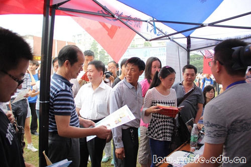 首义校区迎新受到了校领导的高度重视。校党委书记张中华,校长杨灿明等领导来到我院迎新帐篷前查看迎新情况,我院党委副书记袁桂君老师,2014级辅导员杨茹老师向张书记和杨校长介绍我院迎新流程。张书记和杨校长与排队注册的家长和学生亲切交谈。