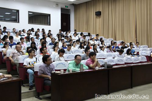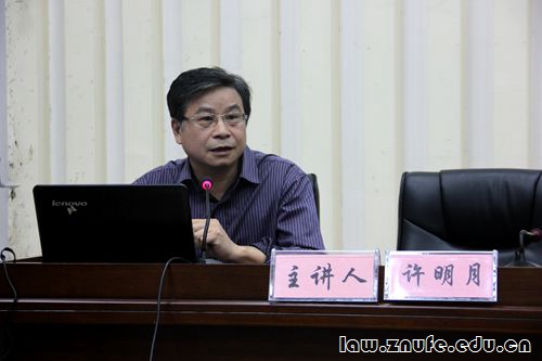 许明月教授表示非常高兴来到我校与大家交流学术问题,继而从担保法的发展引出民法研究中的社会视野这个主题。他说:“现代社会与传统社会相比发生了重大的变化,民事关系的性质也随之变化,因此,民法的研究应该具有社会视野,多关注社会问题。”从传统社会到现代社会,经济、社会层面都发生了显著的变化,主要表现在经济社会化、生活方式的城市化和科技现代化这三个方面,而这些领域的变化,在一定程度上也促进相应法律制度的发展。许明月教授从宏观上解读现代社会的民事关系,并从财产关系、侵权制度等方面系统阐述自己的观点。此外,他还指出,民商法的研究应具有社会关怀,关注社会效果,了解其对社会公平、效率的影响。同时,在研究过程中要善于从宏观的角度考虑问题,关注其他法律制度的存在与发展。在演讲过程中,许明月教授多次提到要在宏观背景下研究民法,强调了民法的社会性。