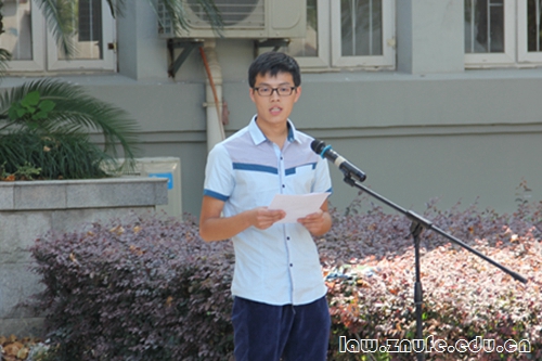 老生代表法1107班徐庆丰同学以自身经历给新生们三点建议,首先要好好规划自己的大学,脚踏实地;其次,要博览群书,厚积薄发;最后还要积极实践,奋斗青春,鼓励新生们一步步向梦想迈进。他相信四年后大家都会成为中国法治未来的弘扬者、传播者和建设者,收获自己最美的奋斗的青春。