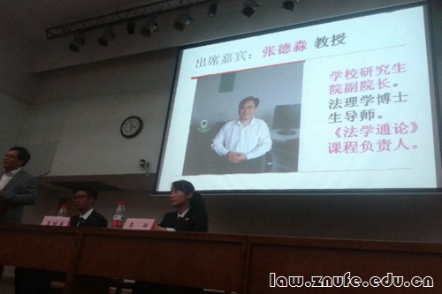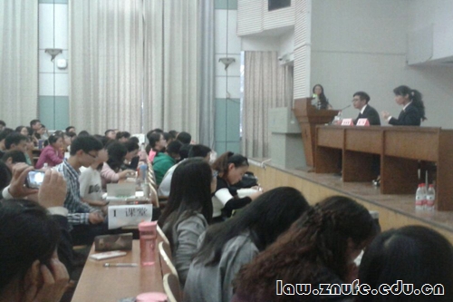 为进一步普及法律知识,丰富教学活动,促进同学们对法律的认识与学习,《法学通论》教研室《以案说法》教研组于2014年10月16日下午4:00-5:30于文澜111教室举行了《法官、检察官说法》讲座,400余名同学参与了此次活动。此次讲座主讲人为湖北省武汉市洪山区人民法院民事审判第一庭庭长,一级法官喻承跃、湖北省武汉市洪山区人民检察院未成年人刑事检察科科长秦雨及湖北省武汉市洪山区人民法院民事审判第一庭法官唐培森。出席讲座嘉宾有研究生院副院长、教授、法理学博士张德淼,法学院主管教学副院长教授、宪法与行政法学博导胡弘弘,法学通论教研室主任、副教授陈军,以案说法主讲教师、讲师李文祥,法学通论教研室副主任、以案说法主讲教师、讲师罗鑫。