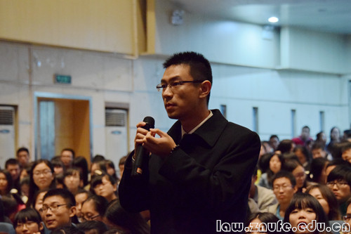 整个讲授过程中,王教授旁征博引,结合丰富的实例使讲座内容充实丰富。讲座结束时,王教授谈到,古有康德对星空和道德法则的思考,现在用一句话来勉励大家,“在我头上,是法律的体系;在我心中,是法律的正义。”