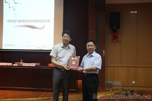 5月21日下午,中国刑事诉讼法学研究会会长,中国政法大学诉讼法学研究院院长、博士研究生导师卞建林教授做客我校,给我校师生带来了一场题为“审判中心:刑事诉讼制度的改革方向”的精彩讲座。我校校长杨灿明教授出席讲座,并向卞建林颁发聘书,聘任卞建林教授为我校客座教授。我校副校长姚莉教授担任主持人,法学院詹建红教授作为点评人,诉讼法学系严本道副教授、尹丽华副教授、张浩老师、郭倍倍老师等作为嘉宾出席了本次讲座。