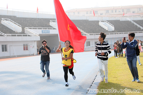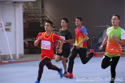 接力赛,是速度与耐力的较量,是协力与默契的对垒。枪声迸放的一瞬间,法学院30×60米迎面接力首棒队员如离弦之箭,一马飞向终点。接棒的同学早已摆好阵势,右臂前伸,上身微倾,灼灼目光凝定在呼啸而来的接力棒上。招臂,交接,攥紧,行云流水之间接力棒已易入下名队员手中,再次破势而出。几番激烈角逐后,法学院由起初暂落后于工商管理学院竞至持平,初显超越势头。鏖战至关键时期,对手的一次失误明朗了局势,我院健儿凭着无隙配合、零掉棒记录,一举拔得头筹!