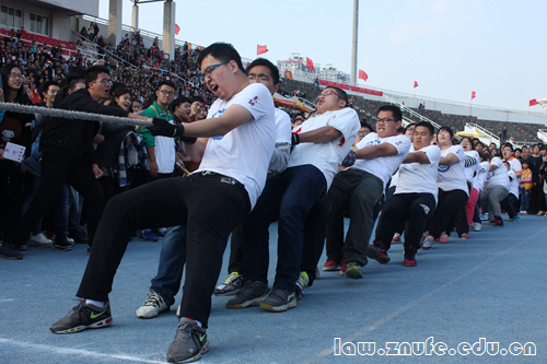 力克财税,再败刑司,与工商管理学院狭路相逢。三通铿锵有力的鼓响,三声短促激昂的“必胜”,法学院拔河队伍斗志宣扬步入赛场。双方队员剑拔弩张——手落,旗舞,赛场的气氛瞬间被点燃。法学院的队员仿佛纪律严整的军队,随着鼓声有节奏地发力,步调一致,稳而不乱。我院师生在一旁助威,激动地振臂高喊。最终,在稳中求进的策略之下,信标开始向法学院一方缓缓移动,其间有数次回头之势,均被立即遏制。一致的步调,不灭的斗志,战术与力量的结合,使法学院队伍再次赢得了比赛。