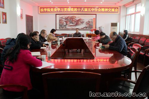 11月19日下午,法学院党委学习贯彻党的十八届五中全会精神交流会在文治六楼会议室召开。院党委肖崇明书记、袁桂君副书记和教工党支部书记参加会议。