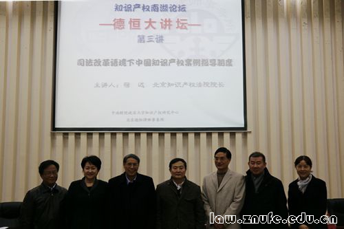 12月5日晚,知识产权南湖论坛德恒大讲坛第三讲“司法改革语境下中国知识产权案例指导制度”在文泓楼报告厅举行。北京知识产权法院宿迟院长为本次讲坛主讲人,我校知识产权研究中心主任吴汉东教授担任主持人。知识产权研究中心常务副主任、知识产权学院副院长曹新明教授,知识产权研究中心研究员马一德教授,我院理论法学系张继成教授担任评议人。知识产权界众多法官、教授到场聆听,讲座也吸引了诸多学生。