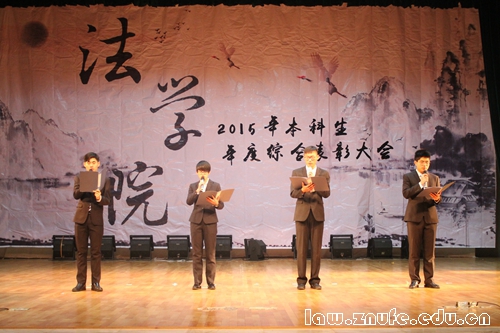 肖崇明书记宣读表彰决定,希望获得表彰的集体、个人继续努力,再创佳绩。十佳优秀班集体民商1301班展示班级风采;外法1301班虞道琪从社会实践、集体活动、志愿服务等方面展示精英寝室风采;校级优秀班级法1210班的汇报体现了法科学子积极向上的风貌;十佳服务团队院报《天爵》的展示呈现其发展历程、发展成果及其为学生服务的决心。于家浩、张一帆等十人获得“十大法科学子”称号。四名获表彰学子诵读诗句,展现法科学子“临池学书”、“深省以辨”、“文体协修”的雄心壮志。