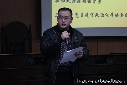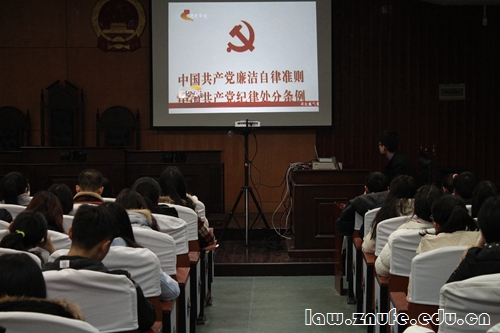 12月30日晚,法学院第三党总支关于党章、《中国共产党廉洁自律准则》、《中国共产党纪律处分条例》的学习会在文泰模拟法庭(二)举行。党总支书记李晓老师、各党支部书记以及全体党员参与了此次学习会,第七支部王泽同志担任学习会主持人。