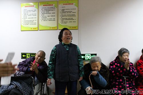 法志协的志愿者为养老院的老人们带去一场别开生面的精彩演出。他们共表演了六个节目,其中包含朗诵毛主席诗词,演唱红色革命歌曲以及跳老人们喜闻乐见的广场舞等,博得在场老人的连声喝彩。其中,令人印象最深的便是唱红歌环节。在场的一位老奶奶积极配合,在志愿者们和其他老人的鼓励下为大家献上嘹亮的歌声,还有一位七十多岁的奶奶给大家带来一段优美的舞蹈,流畅灵活的舞姿没有因岁月蒙尘,令人啧啧称叹。