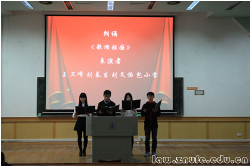 竞演结束后,法学院2014级团总支学生会干部代表带来诗朗诵《歌颂祖国》,感情充沛,真挚动人。