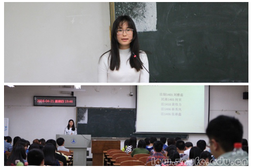 4月21日晚,法学院本科生2014级党总支开展“两学一做”系列活动之“纪念红军长征胜利八十周年——从习近平总书记系列重要讲话中看当代长征精神”主题活动,张玉婷老师和胡坤老师莅临现场,2014级全体党员和入党积极分子参与活动,秦德鑫同志担任主持人。