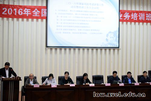 10月11日上午,国家司法考试评卷工作动员暨培训大会在文泓楼一楼报告厅召开,参加大会的来宾有司法部国家司法考试司司长谢愚妮、司法部国家司法考试司副司长晏福增、国家司法考试中心陈庆云处长和办公室曲艺处长,命题专家国家行政学院法学部杨伟东教授、西北政法大学民商法学院程淑娟教授;我校党委副书记齐文远教授、副校长姚莉教授、副校长刘仁山教授,校纪委书记、监察工作部部长蔡明辉以及法学院院长徐涤宇、党委书记肖崇明、副院长麻昌华及2016年国家司法考试评卷工作领导小组全体成员。