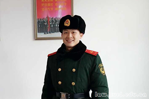 在法学院2015级学生里,有着这样一位特殊的同学。他名叫贝学梁,来自法学1508班,是一名刚从北京武警总部支队退伍的大学生军人。初见他,他穿着简约的白色T恤,挺着直直的脊梁,双臂健壮的肌肉和精神抖擞的言谈尽显军人气息。