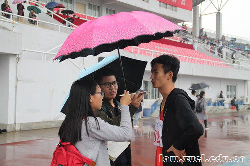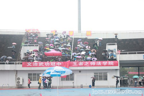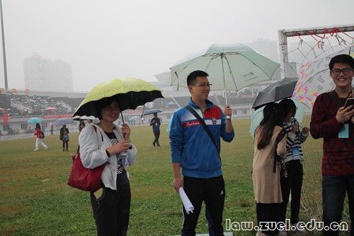 秋风萧瑟,秋雨连绵。在两天的运动会里,法学院党委袁桂君副书记,学生办公室主任郝新春老师,分团委书记王瑄老师、副书记胡坤老师,党政办公室主任李晓老师及各年级辅导员们亲临现场。他们不顾风雨,一直为法学健儿们加油鼓劲。老师们关切的眼神、温情的话语温暖了奋战在风雨中的运动员们的心。