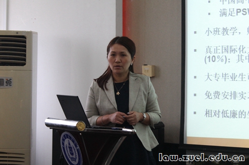 随后,KathyAtkins教授详细介绍了我校和邦德大学留学合作的LLM和JD两种项目。法学硕士(LLM)需要学习2个学期、8门课程,而法学博士(JD)需要学习6个学期、24门课程。法学硕士项目专门给法学本科生开设,领域包括:国际贸易法、国际金融法、争端解决法和公司法等。法学博士的要求相对宽松,只需获得本科学位即可。是为有志向从事法律、交易、工业或者政治工作的学生量身打造。