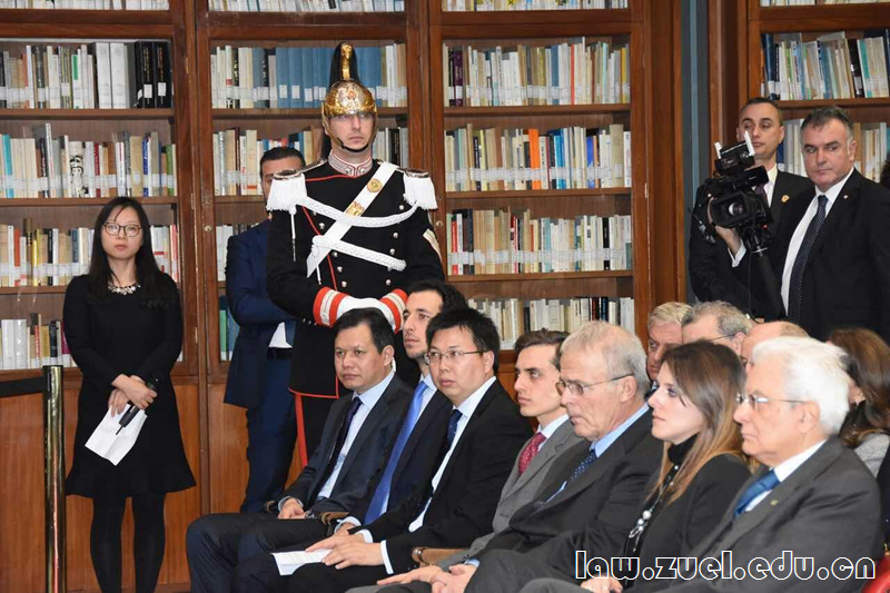 合作协议签约仪式在罗马一大著名的卡拉索教室举行,来自意大利教育部、其他高校法学院院长以及中国驻意大利大使馆临时代办亓菡同志、教育参赞罗平同志等近一百名嘉宾出席,仪式由意大利罗马一大资深法学教授迪利贝托(意大利前司法部部长、我校文澜教授、研究中心负责人)主持。杨灿明校长在致词中首先感谢了总统先生莅临见证两校合作签约仪式,简要介绍了学校作为中国教育部直属的重点建设高校在法学领域的学科特色,回顾了两校合作的历程,承诺在双方共同努力下,把法学研究中心建设成为中意法学教育合作的典范。罗马一大高迪奥校长在致词中强调,两校要加强在罗马法领域的研究与合作,通过这一平台建设,促进两校在科学研究、人才培养、师资交流等方面的合作。徐涤宇院长认为“中意法学研究中心”作为两校法学交流的桥梁,能进一步促进罗马法和意大利法的研究和传播,作为大陆法系源泉的罗马法对中国民法典编纂具有参考价值和现实意义。罗马第一大学法学院院长里多那和法律系主任普拉多高度赞赏“中意法学研究中心”的成立意义,将其视为罗马法传播的新平台,能进一步促进两国和两校法学的交流和合作。巴勒莫大学罗马法教授法尔科勒(Giuseppe Falcone)为纪念罗马法高培班的开创者齐阿泽瑟(Lauro Chiazzese),进行了“罗马法大师们:齐阿泽瑟逝世六十周年”的演讲,将历史、当代和未来的罗马法研究和教育进行了高度总结。在结束主题讲话后,两校校长签署了合作建设中南财经政法大学法学研究中心(罗马)协议,并为研究中心揭牌。
