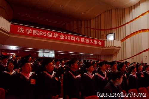 在全场庄严的国歌声中,法学院八五级毕业典礼正式开始。出席本次毕业典礼的嘉宾有前校长吴汉东、校长助理邹秉国、校友工作部副部长万莉、法学院院长徐涤宇、副院长肖志远。此外,熊正刚、宁北川、蔺晓青、池海平、赵家仪作为教师代表,共同出席了本次典礼。