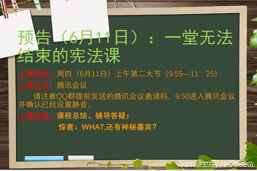 通讯员(江登琴 梁芷涵)611日上午95511:25,武汉室外风雨欲来,而腾讯会议“室内”热闹非凡,老师们的分享、同学们的鼓掌互动此起彼伏。这是16周本科教学周结束之后额外增加的一堂“福利课”,也是胡弘弘老师、江登琴老师合开《宪法学》课程的一次辅导答疑课。虽然老师在课前剧透“会有惊喜”,但当同学们看到两位任课老师到来后还有一位特邀嘉宾——秦小建老师也露脸了,瞬间表示“这惊喜有点大”、“没法淡定了”。
