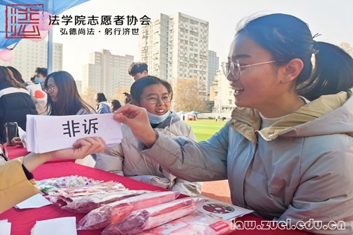12月5日,我校志愿者协会携同各院志愿者协会、公益组织及多所华中高校志愿者协会,在中南财经政法大学首义校区的南运场举办志愿者文化月开幕式,并随即开展第七届中南财经政法大学青年志愿公益嘉年华活动。在法学院志愿者协会的三个帐篷下热火朝天地进行着法言法语、正话反说、通缉令小游戏,吸引了许多同学在此驻足。许多同学顺利通过游戏,获得了贴纸和奖品,他们的脸上洋溢着开心满足的笑容。本次活动既展示了各方志愿者协会的诸多成果,也增进了同学们对志愿精神的理解。法志协独具巧思的小游戏增强了大家的法律意识,展示了法律的趣味和奥妙。