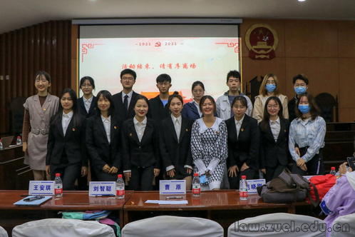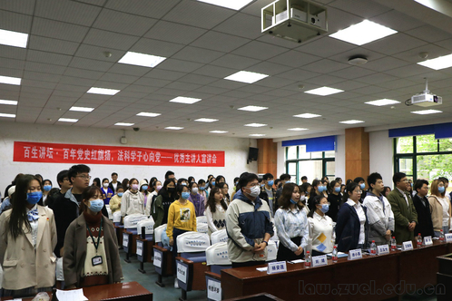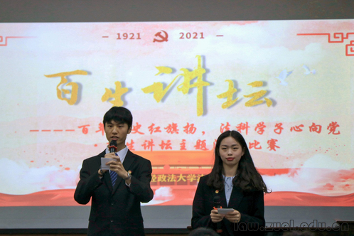 通讯员(柯依澜 杨子涵 甘琳宇 张杰 蒋琼)4月10日下午,法学院“百年党史红旗扬,法科学子心向党·百生讲坛”主题演讲比赛于文泰楼模拟法庭(二)举办。经济学院分团委副书记范晓刚,公共管理学院分团委副书记王泓兮以及法学院六名18级学生代表担任本场嘉宾,众多法科学子作为大众评审到场观看。