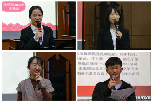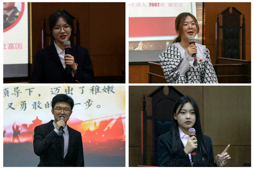 第一位登场的是法2002班的王钰洁同学,她以外公的党员经历为故事脉络,向大家讲述了一位老党员不忘初心、牢记使命的光荣事迹。随后,法2005班的黄静怡同学围绕“百年风雨征程,党旗凝聚岁月”这一题目,饱含激情地述说共产党百年铸就的壮丽史诗。第三位演讲的肖婧雯同学以“坚韧”、“奋斗”和“团结”三个关键词为切入点,慷慨激昂地描绘出共产党波澜壮阔的百年画卷。而2009班的汪乐同学则聚焦于“谈责任、省己身”,号召法科学子时时自省,向党而行。来自法2005班的潘静仪同学表现不俗,通过刻画有为新青年与疫情逆行者的奋斗群像,传递了“以吾青年之力,续写党之辉煌”的思想。随后,法2002班的谢堂洁与法2001班的靳益群同学相继上场,两位选手从容不迫,感情饱满,分别从青年担当与熠熠党史两方面进行讲述。法2016班的盛旭然同学将“青年”与“方向”相结合,呼吁青年行正确方向,建时代新功。而国法2001班的危珈乐同学表现出彩,她选题新颖,视角独特,通过叙述祖辈与父辈的爱党事迹,表达了“青春与党同频共振”的一脉相承、接续奋斗之情。最后登场的王欣丽同学则围绕“初心”、“科学”与“规划”,介绍了共产党彪炳史册的辉煌成就。