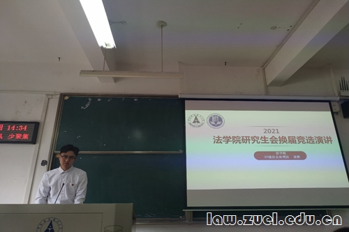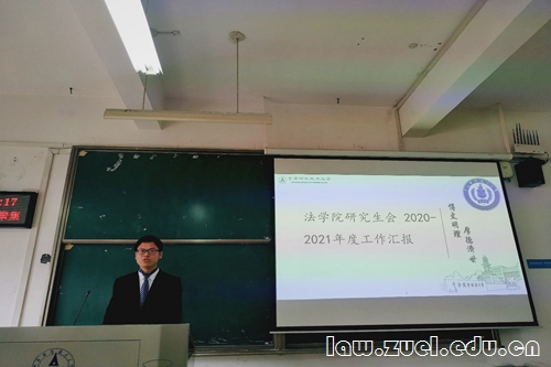 大会第二项,第十四届院研会主席团代表何文野述职。何文野从整体形象、思想建设、学术交流、文体活动、自办刊物、生活服务六方面对第十四届院研会的工作进行了总结,向大家展示了“党史故事青年说”微党课、华中八校模拟法庭对抗大赛等活动的成果,向指导老师和第十四届院研会的所有成员表达感谢。