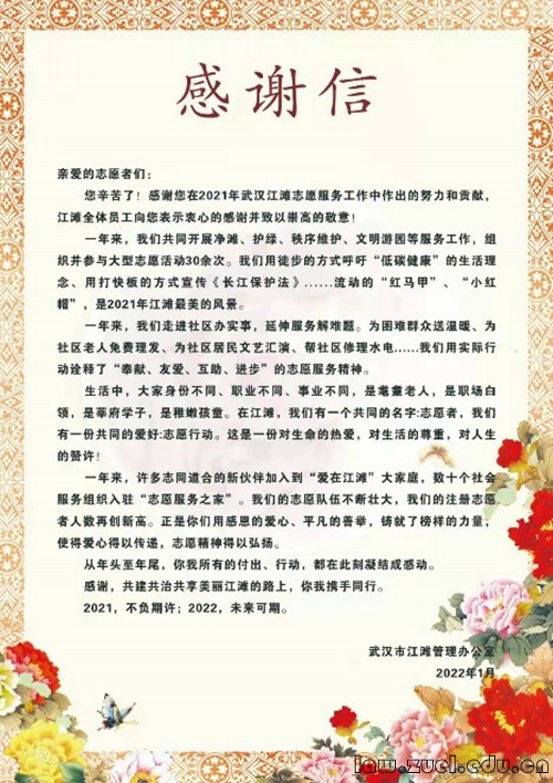 通讯员(杨晨)为表彰2021年度优秀志愿团队及优秀志愿者,弘扬志愿精神,打造最美江滩,1月14日下午,武汉市江滩管理办公室组织召开了2021年度“爱在江滩”阳光志愿服务队总结表彰座谈会,江滩办全体领导出席会议,法学院志愿者协会受邀参加会议。