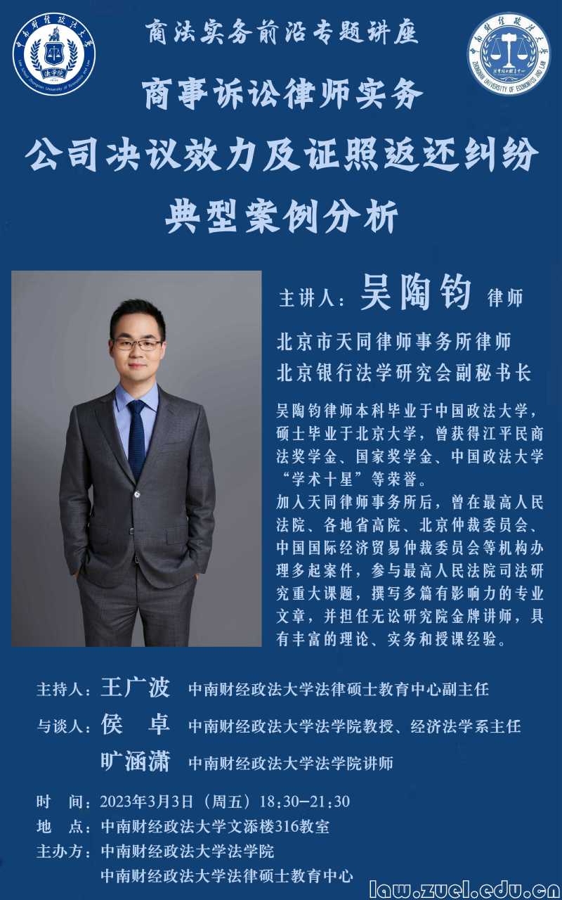 主讲人介绍:吴陶钧律师本科毕业于中国政法大学,硕士毕业于北京大学,曾获得江平民商法奖学金、国家奖学金、中国政法大学“学术十星”等荣誉。加入天同律师事务所后,曾在最高人民法院、各地省高院、北京仲裁委员会、中国国际经济贸易仲裁委员会等机构办理多起案件,参与最高人民法院司法研究重大课题,撰写多篇有影响力的专业文章,并担任无讼研究院金牌讲师,具有丰富的理论、实务和授课经验。