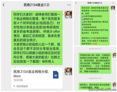 其次,我在班里建立了11个就业小组,每个小组4个人,覆盖到班级每一个同学,由班里的11位中共党员分别担任组长,每周由小组长收集同学们的就业动态,再向我进行汇总,根据同学们现阶段的就业状态,提供相应的帮助,包括简历修改、重点单位推荐与政审前的档案核查等,带动着每一个同学在实现高质量就业的路上不被落下。