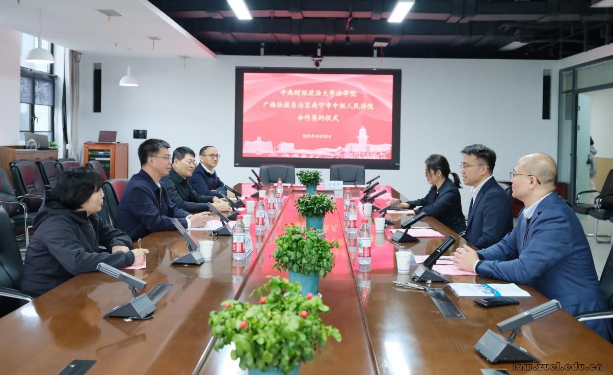 10月20日上午,我院与广西壮族自治区南宁市中级人民法院(以下简称 “南宁中院”)在法学科研大楼309会议室顺利举行院校合作签约仪式。南宁中院党组书记、院长韦武斌,党组成员、政治部主任黄强,办公室主任卓晓阳,研究室副主任唐伟;我院学术院长兼法律专业学位教育中心主任侯猛,副书记、纪委书记兼行政院长陈金川,校友与社会合作办公室刘璐出席本次活动。签约仪式由陈金川副书记主持。