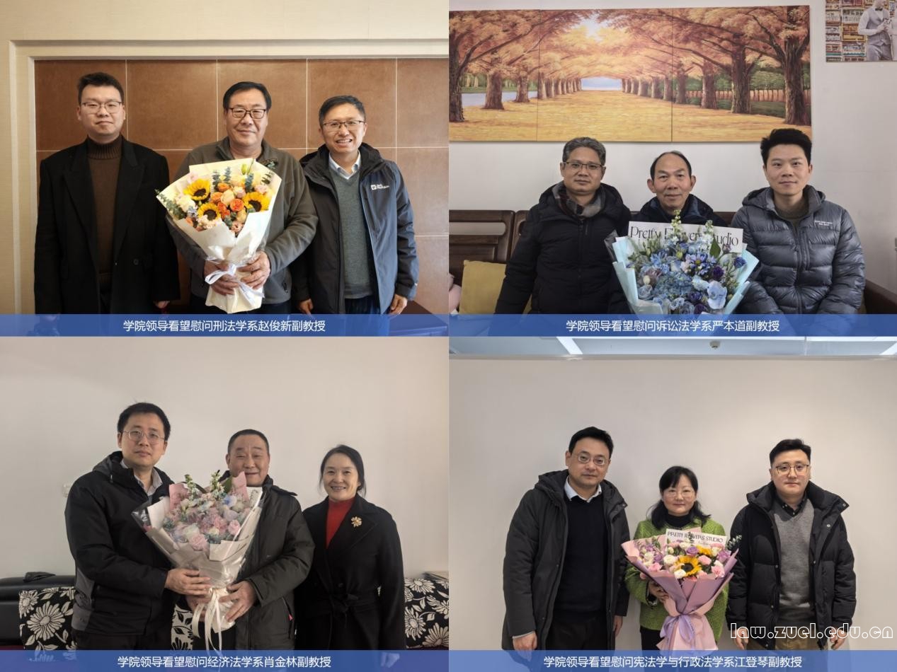在2026年春节即将来临之际,为传承尊师重教优良传统,传递学院大家庭的温暖与关怀。近日,法学院党委书记高碧峰,院长侯猛,副院长杨柳、袁中华、秦小建、侯卓、刘征峰及各系主任等分别看望慰问中南政法学院第一届本科生、原中南政法学院副院长郑昌济老师,“中国法学第一班”班长、中南财经政法大学首任校长吴汉东老师,理论法学系张正平老师,民商法学系彭俊良老师,刑法学系赵俊新老师,诉讼法学系严本道老师,经济法学系肖金林老师及宪法学与行政法学系江登琴老师等老教师和一线教师代表,并向他们致以诚挚的问候和美好的祝福,感谢他们为学院建设发展作出的重要贡献。