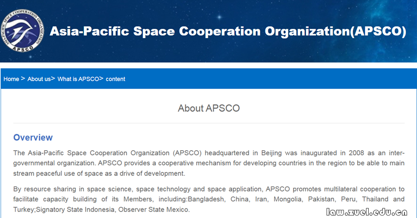 亚太空间合作组织(Asia-Pacific Space Cooperation Organization, APSCO)是由亚太地区联合国成员国组成的政府间国际组织,旨在促进亚太地区空间科技与应用合作,也是继上海合作组织后,以中国为东道国成立的第二个国际组织,成立于2008年,总部设于中国北京。该组织致力于推动和加强成员国间空间技术共同开发、研究、应用和培训的合作,协调成员国贯彻和执行外层空间的法律和政策,促进区域内的可持续发展。其中,依托“亚太空间合作组织空间法律与政策发展战略(2021-2030)”,发展空间法机构的区域和国际联盟成为亚太区域的一个重要议题,经理事会同意,组织于2024年2月正式成立亚太空间法联盟(APSCO Space Law Alliance, ASLA),中南财经政法大学法学院作为创始成员加入。